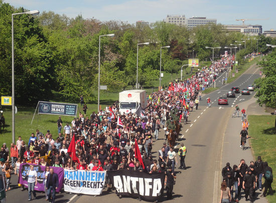 (Mannheim, 1. Mai 2012) Kraftvolle und vielfältige Gegenproteste blockierten bereits nach wenigen hundert Metern einen geplanten Aufmarsch der NPD in Mannheim.