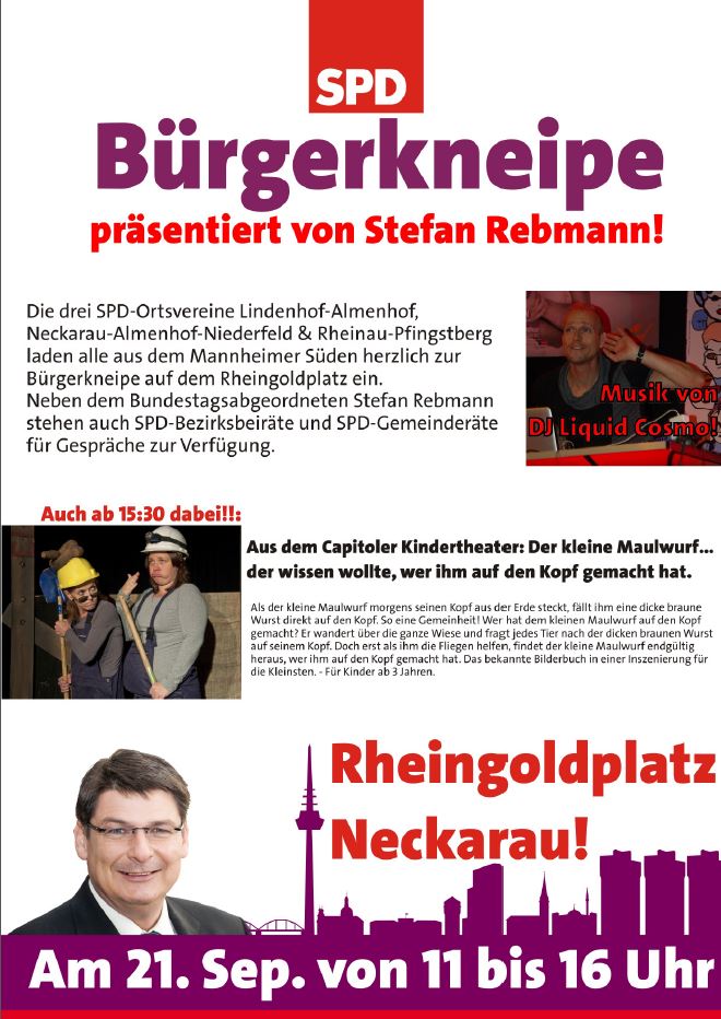 Im Mannheimer Süden wird die Bürgerkneipe am Samstag, den 21. September von 11 bis 16 Uhr auf dem Rheingoldplatz ihre Zelte aufschlagen. Dort soll es insbesondere für Kinder ein attraktives Angebot geben. Um 15:30 Uhr wird das Capitol-Kindertheater das Stück „Das kleine Maulwurf“ aufführen (siehe auch: http://www.capitol-mannheim.de/content/kindertheater-das-besondere-erlebnis-für-die-kleinsten).