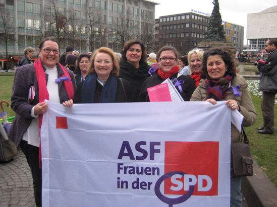 Gemeinsam mit anderen Mannheimer Frauenverbänden trat die ASF Mannheim mit vielfältigen Aktionen anlässlich des 100. Weltfrauentags auf. Neben einem Flashmob auf dem Paradeplatz, stellte die ASF Mannheimer Sozialdemokratinen in einer Präsentation vor und sammelte in einer witzigen Wäscheleinenaktion Stimmen für die Frauenquote.