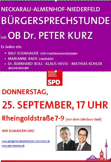 Am Donnerstag, den 25. September findet in der Rheingoldstraße 7-9 vor dem Jakobus-Saal (gegenüber dem Rathaus Neckarau) von 17 bis 18 Uhr die Bürgersprechstunde mit OB Dr. Peter Kurz und Ralf Eisenhauer statt.