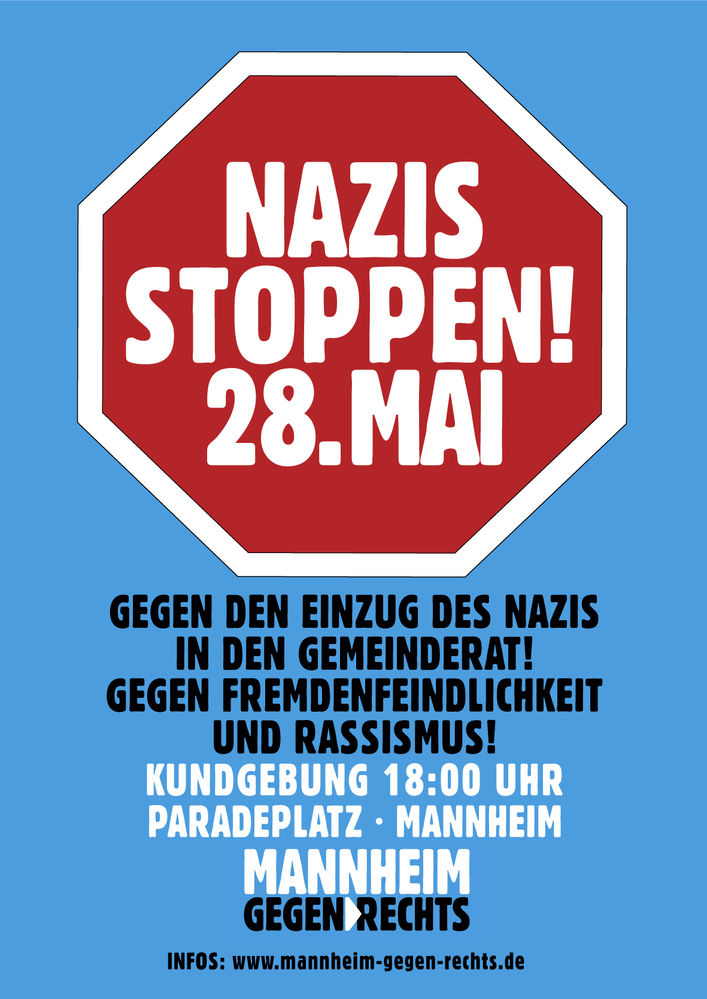 Gegen den Einzug der NPD mit einem Sitz in den künftigen Mannheimer Gemeinderat ruft das Bündnis Mannheim gegen Rechts zu einer Kundgebung am Paradeplatz und einer Demonstration durch die Innenstadt am Mittwochabend, den 28. Mai 2014 um 18 Uhr am Paradeplatz auf.