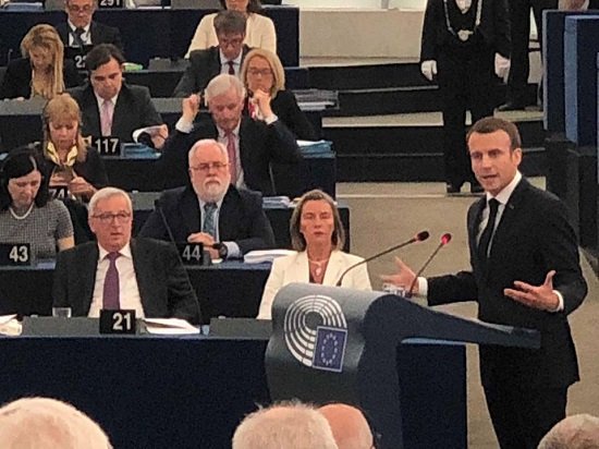 Er betont u.a. die Notwendigkeit eine starke europäische Souveränität aufzubauen, um die Bürgerinnen und Bürger vor von außen kommenden Gefahren wirksam schützen zu können. Auch fordert er ein EU-Programm für örtliche Gebietskörperschaften, die Flüchtlinge aufnehmen. EU-Kommissionspräsident Juncker in seiner Antwort zutreffend: „Frankreich ist wieder da!“