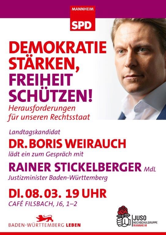 Gemeinsam mit der Juso Hochschulgruppe lädt SPD- Landtagskandidat Dr. Boris Weirauch am Dienstag, 8. März 2016 herzlich zu einem Gespräch mit dem baden- württembergischen Justizminister Rainer Stickelberger ein. Die Veranstaltung findet im Café Filsbach (J6, 1-2) statt und beginnt um 19.00 Uhr.