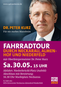 Der SPD-Ortsverein Neckarau-Almenhof-Niederfeld lädt am kommenden Samstag zu einer Fahrradtour durch Neckarau gemeinsam mit Oberbürgermeister Dr. Peter Kurz ein. Treffpunkt ist um 15 Uhr auf dem Niederbrückl-Platz (am Neckarauer Waldweg). Dort werden die ersten Fortschritte zur Neugestaltung des bisher brachliegenden Platzes in Augenschein genommen. Danach geht es mit dem Fahrrad zur Rheingoldstraße ins Ortszentrum. Themen sind dabei u.a. die Frage der einheitlichen Tempo-30-Regelung und die geplanten Fußgängerquerung vor dem Volkshaus