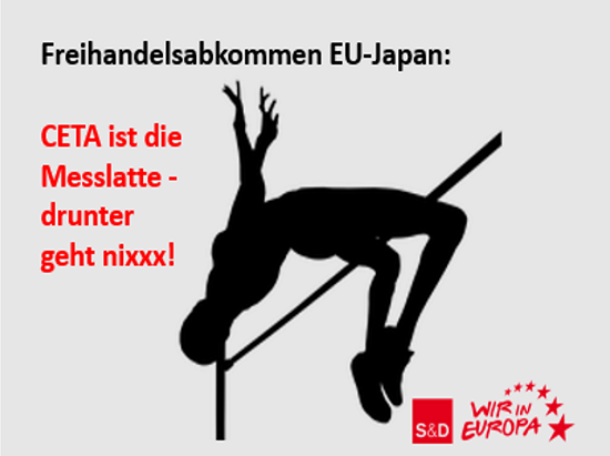 Klar ist: Wir Sozialdemokraten haben im Rahmen der erarbeiteten Standards im CETA-Verfahren eine Grundlage für alle zukünftigen europäischen Handelsabkommen und damit auch für das anstehende Europa-Japan Abkommen geschaffen. CETA mit allen Ergänzungen ist die Messlatte, dahinter werden wir nicht zurücktreten, vielmehr wollen wir unseren Ansatz sogar noch ausbauen.In den kommenden Monaten werden wir deshalb von Seiten des Parlaments eine genaue Prüfung des EU-Japan-Abkommens vornehmen und die klare Positionierung der EU-Kommission einfordern.