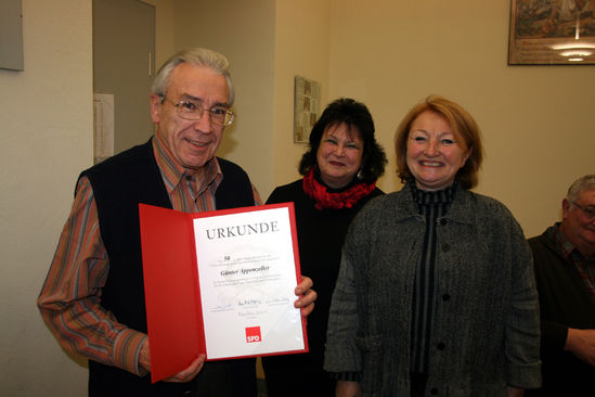 Helen Heberer, Landtagsabegordnete und Kandidatin für den Mannheimer Süden, ehrte Günter Appenzeller auf der Weihnachtsfeier des SPD Ortsvereins Seckenheim für 50 Jahre Mitgliedschaft. Evi Korta-Petry (Bildmitte) übergab ein Weinpräsent des SPD Ortsvereins Seckenheim.