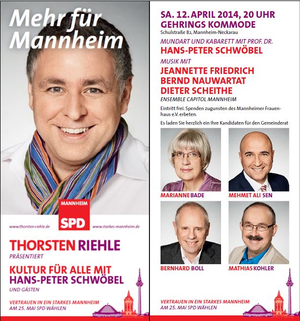 Damit dürfte wohl klar sein, welche politische Einstellung Prof. Hans-Peter Schwöbel vertritt. Für ihn zählt das Handeln jedes Einzelnen. Nicht was, sondern wie einer im Leben steht. Deshalb hat er wenig überlegen müssen, als Capitol-Geschäftsführer Thorsten Riehle ihn ansprach, ob er sich vorstellen könne ihn im Wahlkampf zu unterstützen. Schließlich will Riehle im Mai in den Stadtrat und für die SPD Kulturpolitik machen. „Und wenn der Mist verzapft, dann ziehe ich ihn an den Ohren lang.“ Na das dürfte politische Motivation genug sein! Als Kabarettist und Sozialwissenschaftler schaut Schwöbel den Leuten sprichwörtlich „aufs Maul“. Er sagt was er denkt und denkt was er sagt.