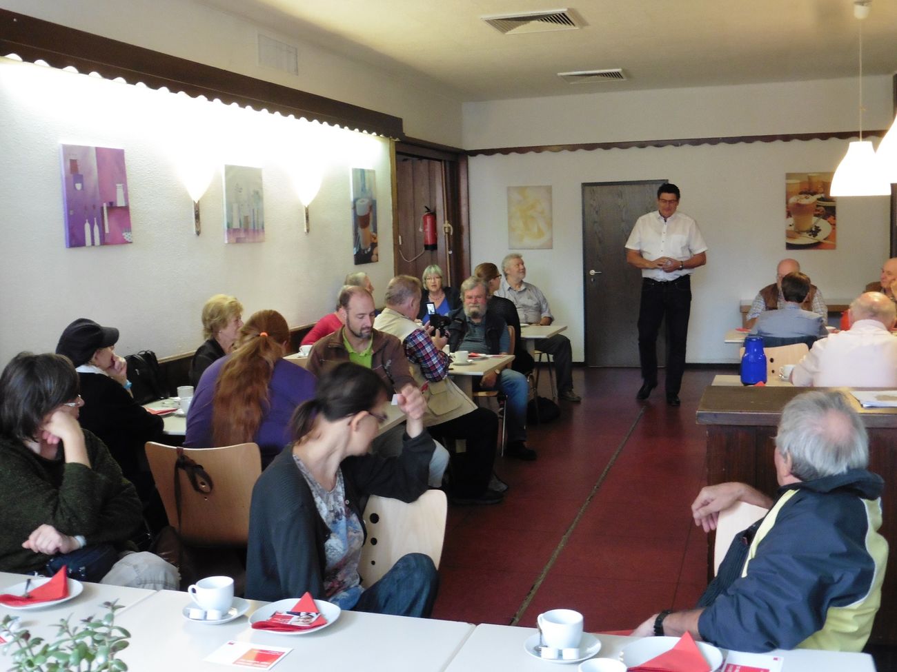 Es gab intensive Diskussionen über den Umgang mit Flüchtlingen, über den Bau notwendiger Sozialwohnungen, über die Bürgerversicherung, über die Mängel im Schulsystem, über Ausbildungsplätze, über kostenlose Bildung bereits ab der Kita, als Beitrag zur sozialen Gerechtigkeit und vieles andere mehr. Stefan Rebmann ging nach seiner Einführung von Tisch zu Tisch und diskutierte mit den Gästen alle angeschnittenen Fragen und Themen.