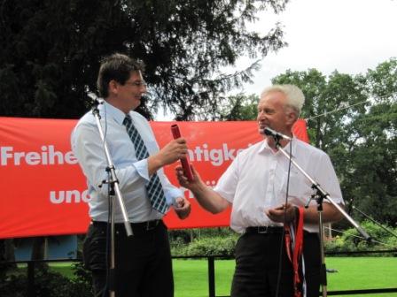Der scheidende Bundestagsabgeordnete Lothar Mark übergibt die Stafette an den neuen Kandidaten Stefan Rebmann Dass der August-Bebel-Park ein idealer Ort zum Feiern ist, bewies einmal mehr der SPD-Ortsverein Neckarau, der dort zum 35. Mal sein Sommerfest feierte. Die Schirmherrschaft hatte Bundestagskandidat