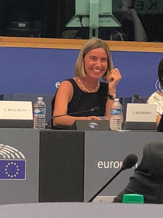 Federica Mogherini, sozialdemokratische „Außenministerin“ der EU, heute Abend in Straßburg zum Bericht in „ihrer“ Fraktion