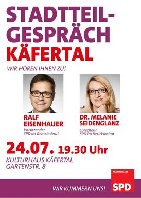 Am 24. Juli veranstaltet die SPD-Gemeinderatsfraktion zusammen mit dem SPD-Ortsverein Käfertal ihr nächstes Stadtteilgespräch. Bürgerinnen und Bürger sind aufgefordert, ihre Meinung zu aktuellen Themen im Stadtteil und in der Stadt zu äußern und ihre Sicht der Dinge zu schildern.