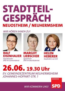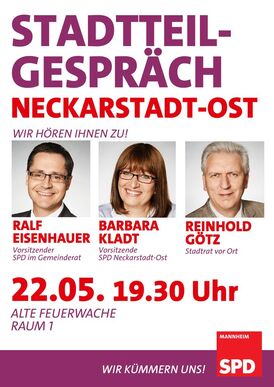 SPD-Gemeinderatsfraktion und SPD Ortsverein Mannheim-Ost laden zum Stadtteilgespräch Neuostheim/Neuhermsheim ein.