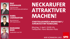 Wir laden Sie gemeinsam mit dem SPD-Ortsverein Innenstadt/ Jungbusch und unseren Mitgliedern im Bezirksbeirat herzlich zum Stadtteilgespräch ein am Montag, 3. April, 19.00 Uhr, Treffpunkt Hans-Böckler-Platz, Hans-Böckler-Straße 3.