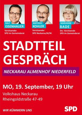 Am Montag, den 19. September um 19 Uhr findet das nächste Stadtteilgespräch der SPD-Gemeinderatsfraktion statt - dieses Mal im Volkshaus Neckarau, Rheingoldstraße 47.