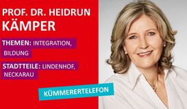 Stadträtin Prof. Dr. Heidrun Kämper bietet am Mittwoch, 7. Juni von 18 bis 19 Uhr unter der Nummer 0621/ 293-2094 eine telefonische Sprechstunde an. Sie kümmert sich insbesondere um die Stadtteile Lindenhof und Neckarau. Ihre Themen sind Integration und Bildung.