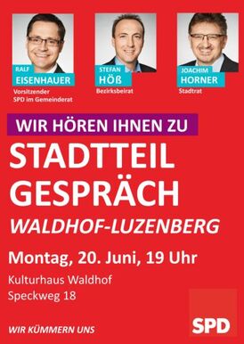 SPD-Gemeinderatsfraktion und SPD-Ortsverein Waldhof-Luzenberg laden für den 20. Juni von 19:00 Uhr bis 21:00 Uhr zum Stadtteilgespräch ins Kulturhaus Waldhof, Speckweg 18 ein.