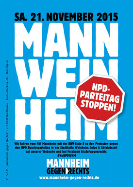 Am 21. und 22. November 2015 soll erneut ein Bundesparteitag der neofaschistischen NPD in der Weinheimer Stadthalle stattfinden. Funktionäre der Nazi-Partei aus der gesamten Bundesrepublik wollen sich zum dritten Mal in Weinheim versammeln, um ihre rassistische und nationalistische Politik zu planen, für ihre menschenverachtenden Ziele zu werben und ihre demokratiefeindliche Strategie zu entwickeln.
