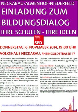 Dem SPD-Ortsverein Neckarau-Almenhof-Niederfeld ist wichtig, diese Vielfalt perspektivisch zu sichern und die Schulweiterentwicklung im Stadtteil zu unterstützen. Angesichts der Schließung der Werkrealschule an der Schillerschule muss bei der Schulentwicklung im Stadtbezirk über eine neue Konzeption nachgedacht werden. Hierzu lädt der SPD-Ortsverein die Eltern, Lehrer und alle Interessierten zu einer Dialogveranstaltung ein, um unterschiedliche Sichtweisen und Ideen in diesen Entwicklungsprozess einbringen zu können. Die Veranstaltung findet am Donnerstag, den 6. November um 19 Uhr im Volkshaus Neckarau, Rheingoldstraße 47, statt.