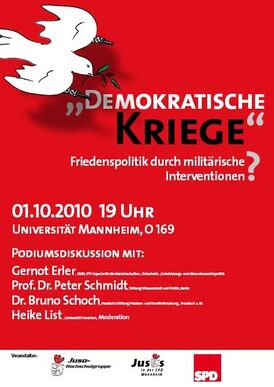 Die SPD-OVs Innenstadt/Jungbusch, Oststadt und Neckarstadt-West sowie die Jusos und die Hochschulgruppe der Universität Mannheim laden ein am Freitag, 01. Oktober 2010 zu einer Abendveranstaltung um 19 Uhr zu neuen Herausforderungen deutscher Außenpolitik mit dem Thema: