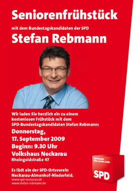 Der SPD-Ortsverein Neckarau-Almenhof-Niederfeld lädt zu einem kostenlosen Seniorenfrühstück mit dem SPD-Bundestagskandidaten Stefan Rebmann ein. Im Rahmen dieses Frühstücks besteht die Möglichkeit, mit Stefan Rebmann ins persönliche Gespräch zu kommen.