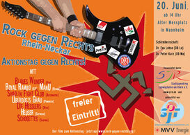 Am 20. Juni 2008 ist es wieder soweit: Das Open-Air-Konzert „Rock gegen Rechts“ geht in diesem Jahr als „Aktionstag Rock gegen Rechts Rhein-Neckar“ in seine dritte Runde und soll sich weiterhin zu einem jährlich festen Termin in der Rhein-Neckar-Region etablieren. Veranstaltungsort in diesem Jahr ist der „Alte Messplatz“ in Mannheim, Konzertbeginn ist um 14.00 Uhr nach Schulschluss, Ende der Veranstaltung ist für 22.30 Uhr angesetzt. Der Eintritt für das Konzert ist frei!