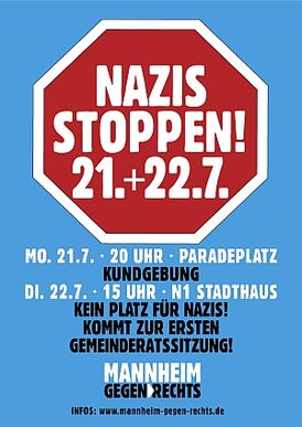 "Mannheim gegen Rechts", die parteiübergreifende Mannheimer Initiative, lädt zur Kundgebung am 21. Juli. Hintergrund ist der Einzug eines NPD-Vertreters in den Mannheimer Gemeinderat. Dieser kommt am 22. Juli zur Konstituierung zusammen. Alle sind eingeladen, am 21. Juli ein Zeichen zu setzen und am nächsten Tag auch zur Sitzung des Gemeinderats zu kommen.