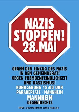 Gegen den Einzug der NPD mit einem Sitz in den künftigen Mannheimer Gemeinderat ruft das Bündnis Mannheim gegen Rechts auf zu einer Kundgebung am Paradeplatz und einer Demonstration durch die Innenstadt am