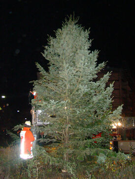 Der diesjährige Weihnachtsbaum der Bürgerinitiative Gontardplatz wurde mit Hilfe von Feuerwehrjugend und der Freiwilligen Feuerwehr selber am Freitag am Gontardplatz aufgestellt.