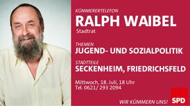 Stadtrat Ralph Waibel bietet am Mittwoch, den 18. Juli von 18 bis 19 Uhr unter der Nummer 0621/ 293-2094 eine telefonische Sprechstunde an. Er kümmert sich insbesondere um die Stadtteile Seckenheim und Friedrichsfeld. Seine Themen sind Jugend- und Sozialpolitik.