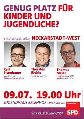 Weiter geht es mit unseren Stadtteilgesprächen. Am 9. Juli sind wir zu Gast im Jugendhaus Erlenhof. SPD-Gemeinderatsfraktion und SPD-Ortsverein Neckarstadt-West laden ein für
