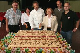 „Kinderspektakel“, war in großen Lettern auf der riesigen Torte zu lesen, die von der Mannheimer Bäckerinnung zum beliebten Familienfest im Luisenpark spendiert worden war. „Das ist ja ein Kunstwerk“, meinte die SPD Landtagsabgeordnete Helen Heberer beim Anblick der detailgetreuen Ornamente und Verzierungen und gemundet hat die über einen Quadratmeter große Torte selbstredend auch noch. Kreiert wurde die außergewöhnliche Köstlichkeit in der Bäckerei Leisinger. Gleich mehrere Konditoren hatten sich ins Zeug gelegt, um in vielen Arbeitsschritten die süße Versuchung aus Marzipan und einem Vanille-Schoko-Biscuit entstehen zu lassen. Kein Wunder, dass, sobald die Torte angeschnitten war, unzählige Süßspeisen Fans mit ihren Tellern bereit standen. Etwa einhundert Metropolitaner in Muffin-Form waren ebenfalls gebacken worden und fanden beim 19. Kinderspektakel gleichermaßen großen Anklang.