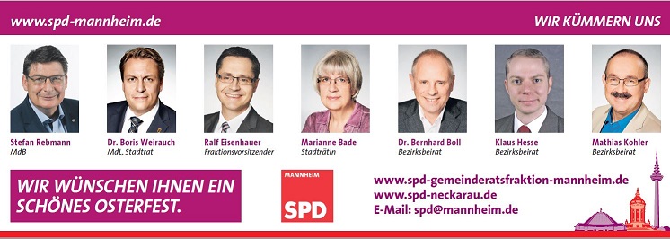 Der SPD-Ortsverein Neckarau-Almenhof-Niederfeld, der Bundestagsabgeordnete Stefan Rebmann, der Landtagsabgeordnete Dr. Boris Weirauch, der Fraktionsvorsitzende Ralf Eisenhauer, die Stadträtin Marianne Bade sowie die Bezirksbeiräte Dr. Bernhard Boll, Klaus Hesse und Mathias Kohler wünschen Ihnen ein schönes Osterfest, viel Sonne und vorallem Glück.